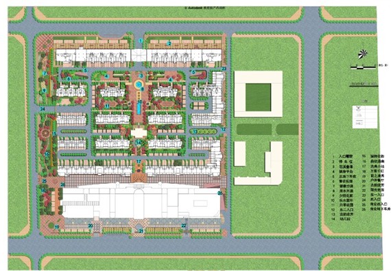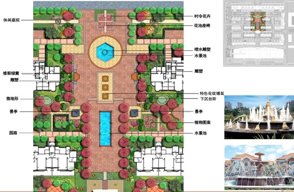 項目考慮“人、自然、空間”之間的和諧關(guān)系,堅持以人為本的設(shè)計理念,在設(shè)計中以生態(tài)環(huán)境優(yōu)先為原則,充分考慮建筑和景觀之間的關(guān)系,通過材料和造型的運用,將歐式建筑和新古典景觀進行風(fēng)格樣式上的對接。在規(guī)劃的同時,輔以景觀設(shè)計,最大限度的體現(xiàn)居住區(qū)本身的底蘊。設(shè)計中結(jié)合當(dāng)?shù)靥厣谛^(qū)中設(shè)置小區(qū)中心景觀軸線、橫向景觀帶、生態(tài)種植區(qū)等。在中心景觀軸線當(dāng)中設(shè)置了歐式的矮墻噴泉、花溪疊瀑、下層廣場、噴泉水景等,使居民樂居其中。規(guī)劃設(shè)計注重園林景觀的可參與性,在小區(qū)內(nèi)設(shè)置開闊的硬質(zhì)景觀,如波紋鋪地、琴韻廣場等。小區(qū)內(nèi)公共空間、私密、半私密空間如:下層廣場和健康步道兩者的公共性和私密性設(shè)計對比強烈,動靜結(jié)合。通過不同的景觀設(shè)計,也為小區(qū)居民提供空間上充足、多樣的休閑、交往、活動場地,營造和諧、友善、溫馨的人際關(guān)系氛圍。