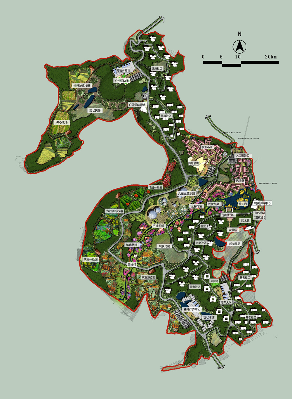 以山、水、田、園、林為自然環境基底;以萬州特色花果文化、休閑文化為主線;打造以花果為主題,以特色農業休閑、文化養生、養老居住為主導產品形態,滿足游客休憩、康體、娛樂、度假、養生養老居住等多樣化需求的都市農園綜合體