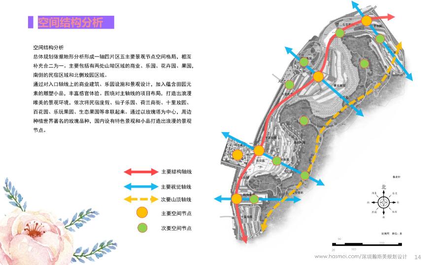 總體規(guī)劃依據(jù)地形分析形成一軸四片區(qū)五主要景觀節(jié)點(diǎn)空間格局,相互補(bǔ)充合二為一。主要包括有兩處山坳區(qū)域的商業(yè)、樂園、花卉園、果園,南側(cè)的民宿區(qū)域和北側(cè)玫園區(qū)域。