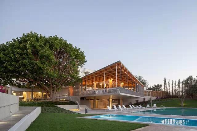 建筑面向泳池,底部挑空,二層大屋頂采用了更省材料的格柵式構架,中心開一個方洞改善采光通風條件。扶手欄桿的花紋與玻璃幕墻外的遮光柵欄的花紋一致,并合并為一個整體。