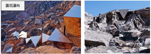 鏡面不銹鋼制成的倒三棱錐,錯落置于山坡上,椎體表面鋼板較薄產生形變,呈現出一種微妙的介于隱形與顯形之間的狀態。